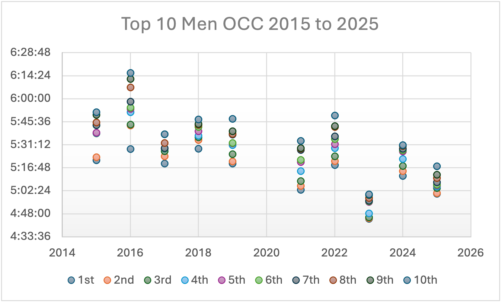 It is important to note that in certain years the course has been changed (such as in 2025, because of bad weather), so a comparison between years is not a direct like with like. However, we can still see a clear downward trend in the finish times of the top 10 women competing in the OCC. Another clear trend is the grouping of the top 10, with the past 4 editions being the 4 closest among all the years reviewed. In fact, 2024 showed a particularly tight top 10 in the women’s race.